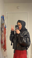 A head scarf? A kerchief? Call it what you will. Our Babushka Scarf in Black will keep you toasty and granny-chic. Versatile and made with supple vegan leather, a felted lining and hand-finished seams. Also available Lilac, and Toffee!